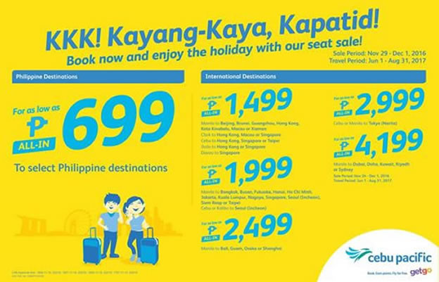 Get this amazing Cebu Pacific Promo: KKK! Kayang-kaya, Kapatid! Book now and enjoy the holiday with Cebu Pacific Seat Sale! Enjoy the holiday with the new seat sale! Book now until December 1, 2016! For as low as P699. You can buy this promo up to November 29, 2016 or until seats last and travel period on June 1, 2017 to August 31, 2017.